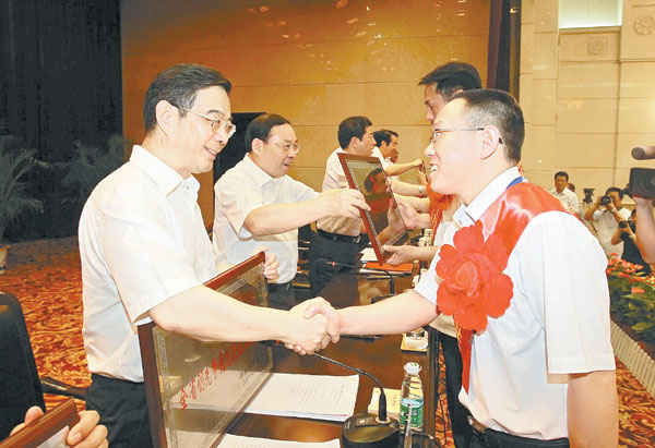 6月30日,周强等省领导为受表彰的先进集体和优秀个人颁奖。 本报记者 张目 摄