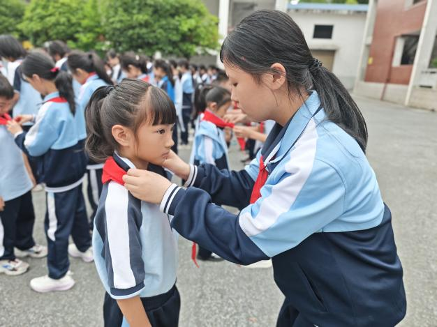 5月27日,彩韵坪上队旗飘扬,入队仪式在庄严的出旗曲中拉开帷幕。当《我们是共产主义接班人》的旋律响起,全场队员齐声高唱,歌声中饱含对少先队组织的向往与崇敬。大队辅导员李丹莉宣读新队员名单后,六年级优秀队员代表为新队员郑重佩戴红领巾。一(1)班胡欣滢作为新队员代表发言,稚嫩的童声中透着坚定:“红领巾是少先队员的标志,我会像爱护眼睛一样爱护它,用实际行动为它增光添彩!”在队旗下,新队员们紧握右拳庄严宣誓,“准备着:为共产主义事业贡献力量!” 的誓言响彻云霄。